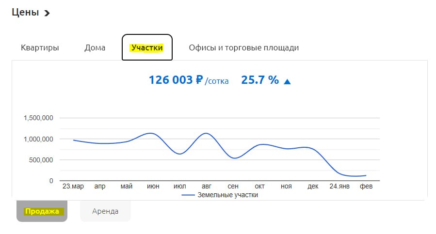 За последний год стоимость сотки в районе Москвы упала на 87%. За месяц изменение составило 25,7%. Если в феврале собственники просили 169 тыс руб за сотку, то в марте — 126 тыс. руб.