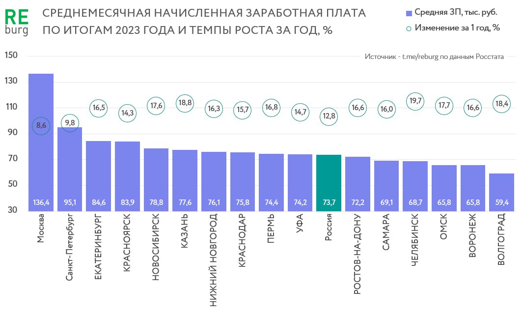 🤑 Собрали данные по среднемесячной начисленной заработной плате в 2023 году в крупнейших городах страны. Можно по-разному относиться к «средней ЗП», но она дает неплохое представление о месте конкретного города с точки зрения возможностей рынка труда. Также интересны темпы изменения данного показателя за последний год.